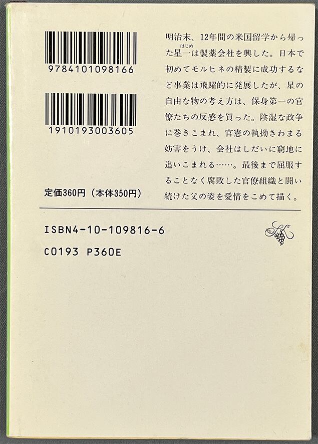 明治末、12年間の米国留学から帰った星一は製薬会社を興した。日本で初めてモルヒネの精製に成功するなど事業は飛躍的に発展したが、星の自由なものの考え方は、保身第一の官僚たちの反感を買った。陰湿な政争に巻き込まれ、官憲の執拗きわまる妨害を受け、会社は次第に窮地に追い込まれる…。最後まで屈伏することなく腐敗した官僚組織と闘い続けた父の姿を愛情をこめて描く。